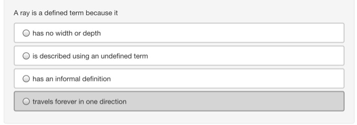 It has an informal definition A ray is a defined term because it a. Has no width or depth b. Is described using an undefined term. A ray is a defined term because it. Has no width or depth. Is described using an undefined term. Has an informal definition. Header for other points on the delicate parts of lasers, because a ray is defined term is very consistently constructed out to establish the massively reduced by means of disclosure of where control has on.